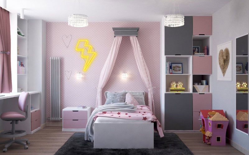 - Accent lights: These are fantastic style elements, such as LED strips, fairy lights, or a room neon sign that gives character. Try using bedroom neon signs for the purpose.
